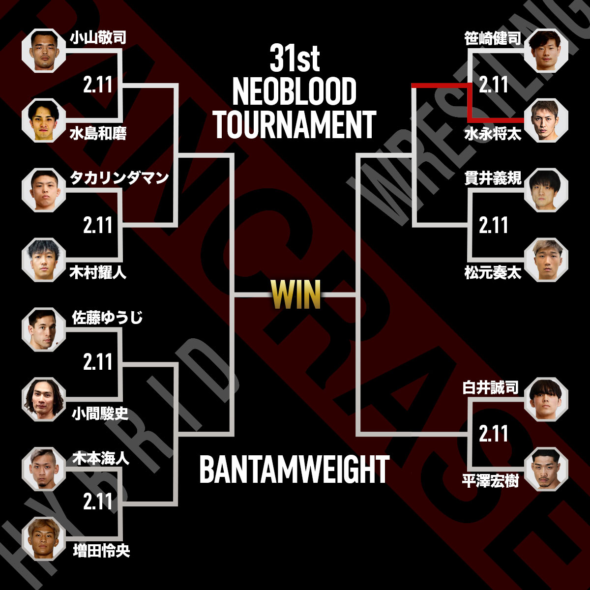 | 笹崎選手が蜂窩織炎の為に欠場、水永選手の不戦勝です。この対戦カードを楽しみにされていた皆様に、深くお詫び致します。 | ||||
